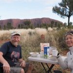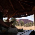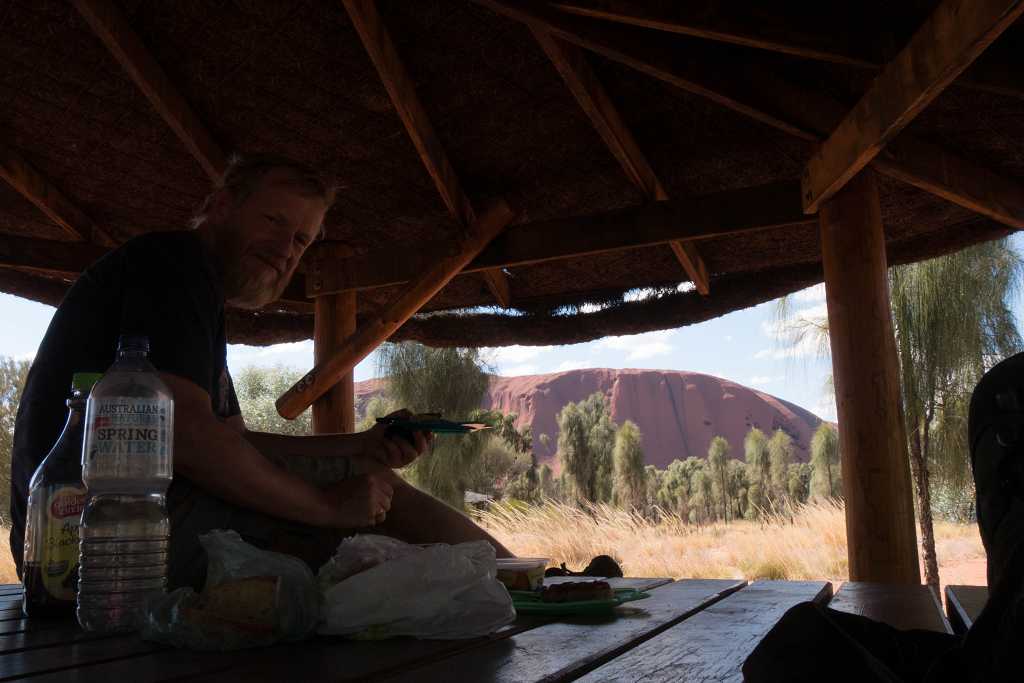Zur Mittagszeit essen wir unsere Mahlzeit mit direktem Blick auf den Uluru.