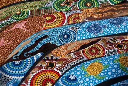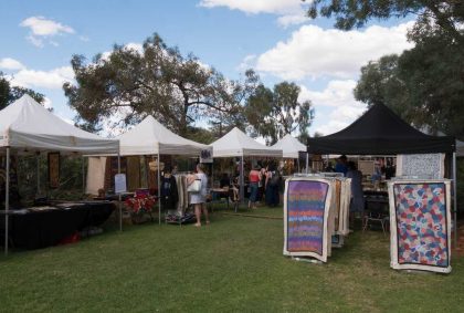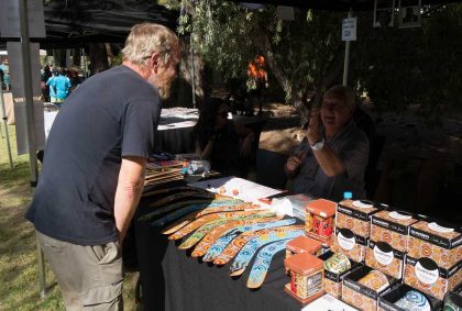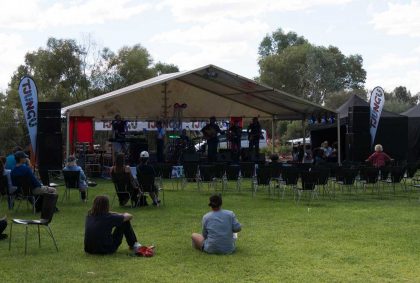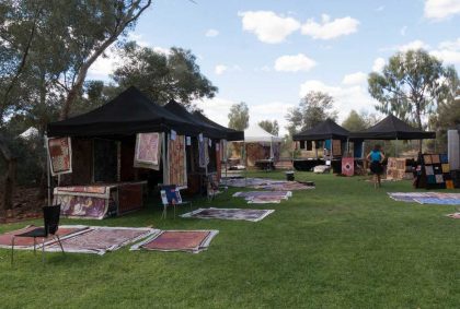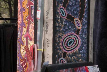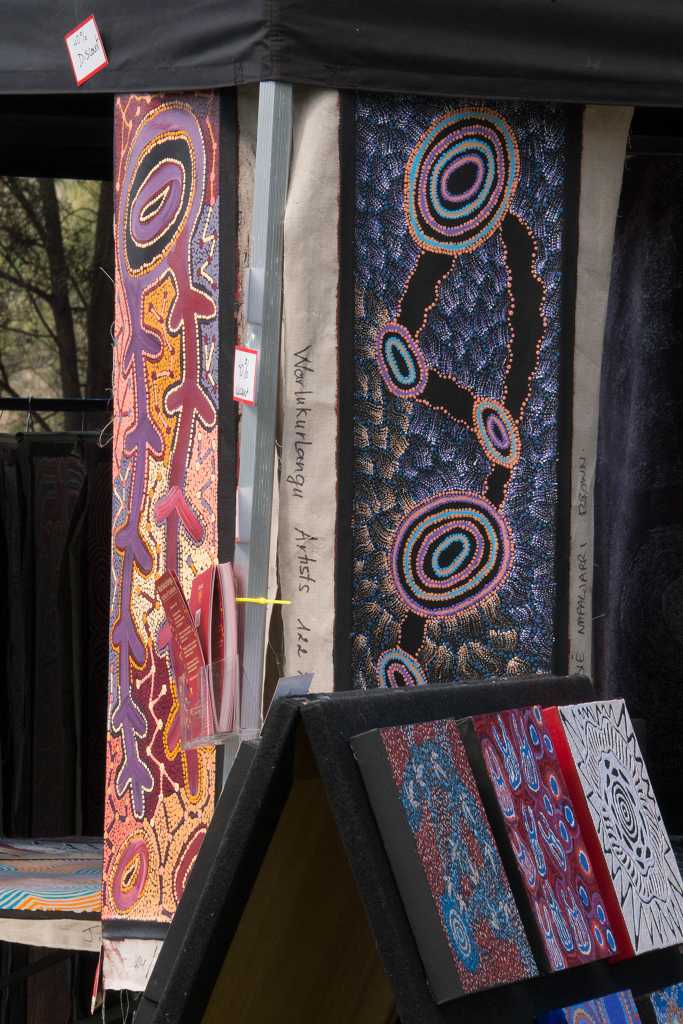 Anschließend fahren wir zurück nach Yulara und besuchen das tägliche Kulturprogramm im Stadtzentrum. Auf einer Bühne spielt eine Band, Kinder springen fröhlich und ausgelassen auf der Wiese herum und an verschiedenen Ständen wird Kunsthandwerk der Aborigines angeboten. Ich kaufe mir eine kleine Krempeltasche im Aboriginal-Look.