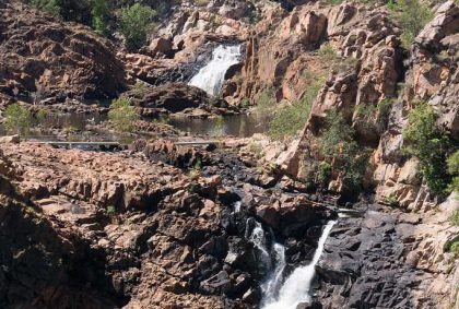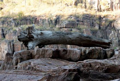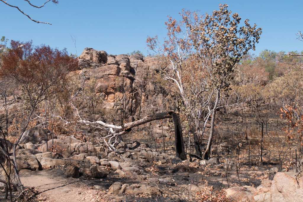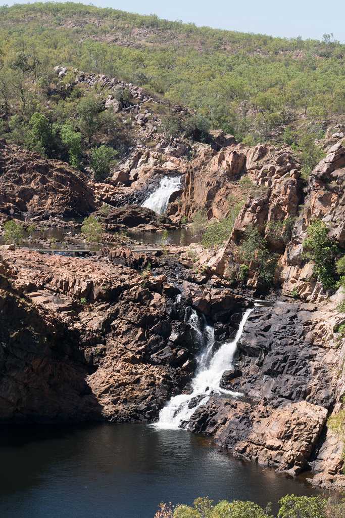 Ein Abstecher zu den „Leliyn Edith Falls“, die wir über den 2,5 km langen Loop erreichen, ist noch möglich. Der Weg führt durch kürzlich abgebrannten Bushland, ist deshalb nicht so besonders ansehnlich fürs Auge aber oben hat man eine schöne Aussicht auf die Wasserfälle.
