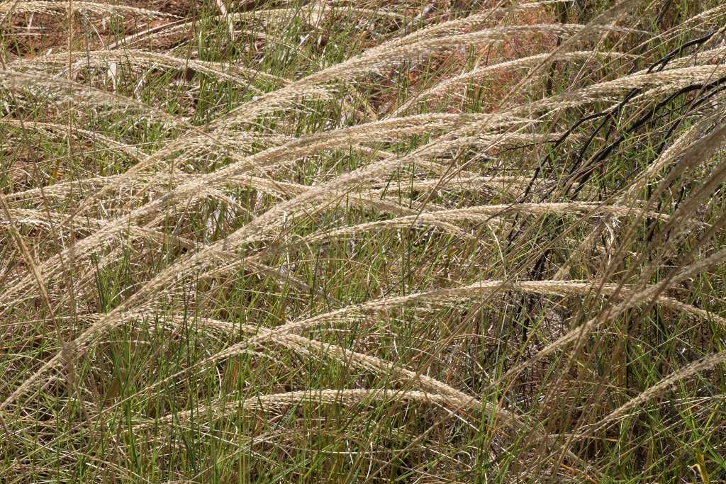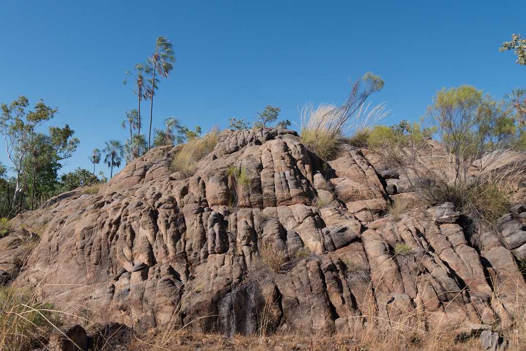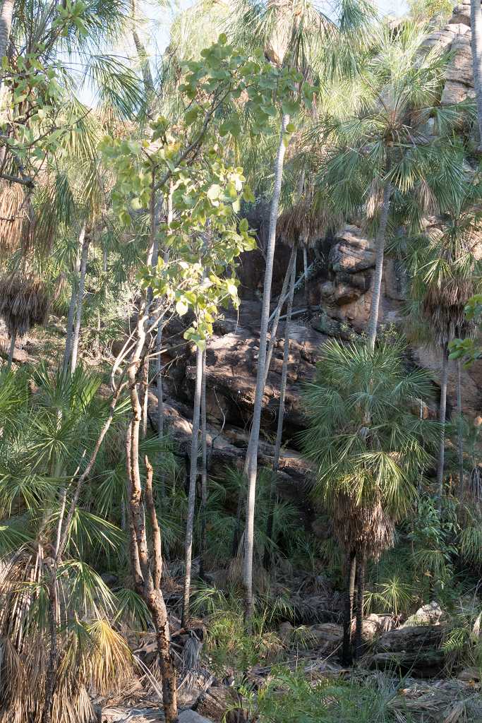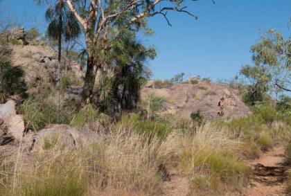 Der nächsten Teil der Wanderung bis zur Southern Rockhole ist wieder sehr schön zu laufen. Ein schmaler Pfad auf tiefrotem Sand mit felsigen Abschnitten dazwischen wechselt später durch hohes Gras, Palmen und Eucalyptus. Immer wieder ragen bizarre Felsformationen hinter den Bäumen hervor.