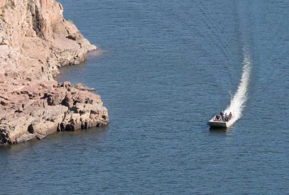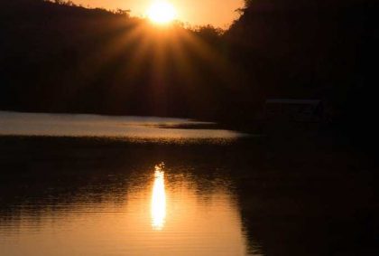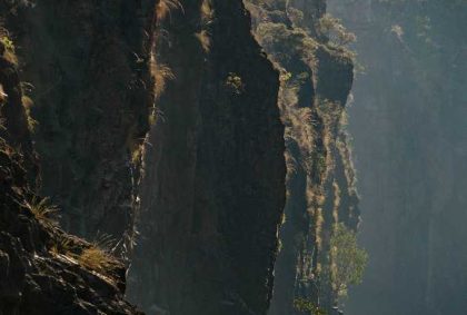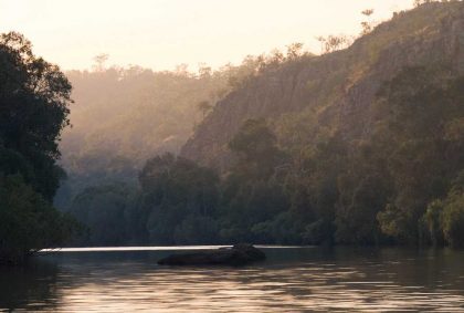 Friedlich gleitet das Boot über den Fluss, immer der Sonne entgegen, die langsam höher steigt und die oberen Felsabschnitte mit einem goldenen Licht umhüllt.
