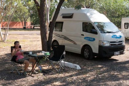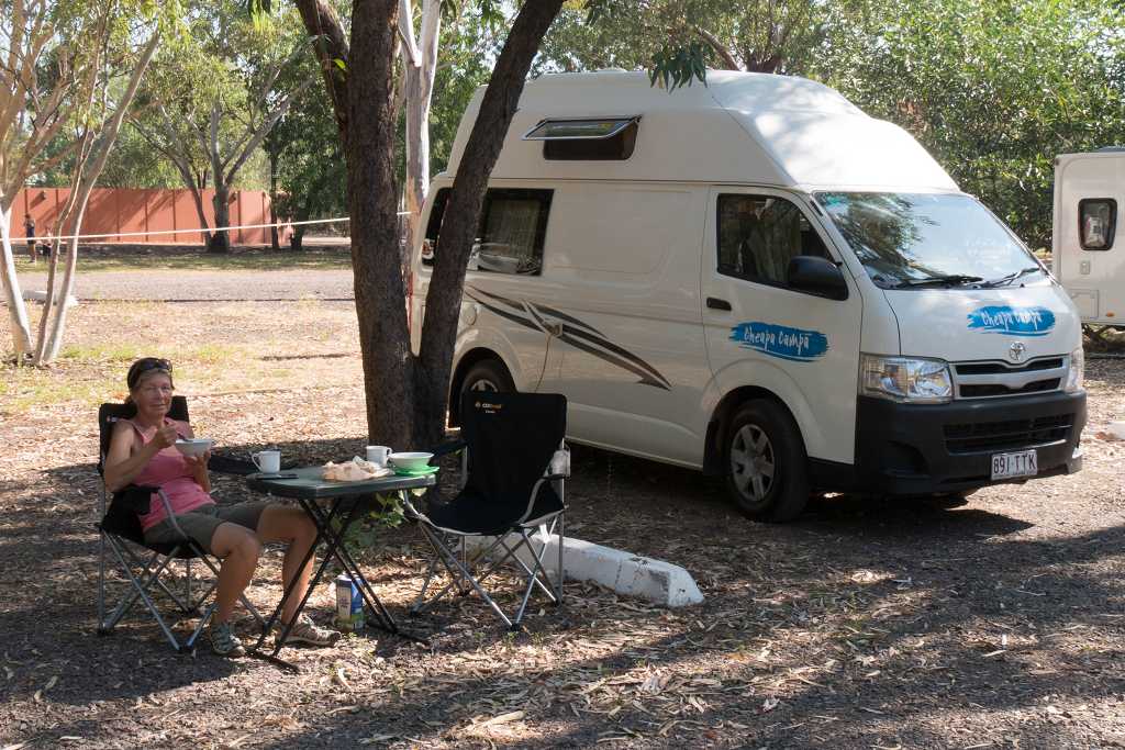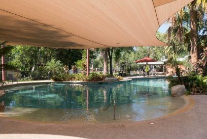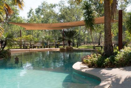 Am „Nitmiluk CamperVan Park“ direkt am Visitor Center können wir unseren Stellplatz frei wählen. Besonders verlockend ist an diesem heißen Tag für uns der schöne Außenpool.