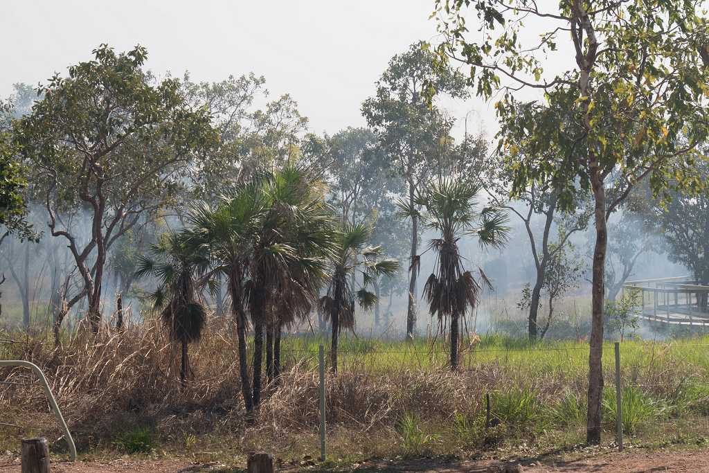 Auf der Hochebene dann haben wir eine super Aussicht über die Eukalyptuswälder des Litchfield Nationalparks. In der Ferne allerdings hängt eine dicke Smogschicht zwischen Wald und Himmel, eine Folge des Bushfeuers.