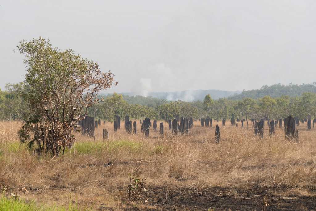 Das verbrannte Umland und die mit Ruß verschmutzten Termitenhügel bieten einen traurigen Anblick, wir halten uns hier nicht lange auf.