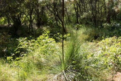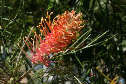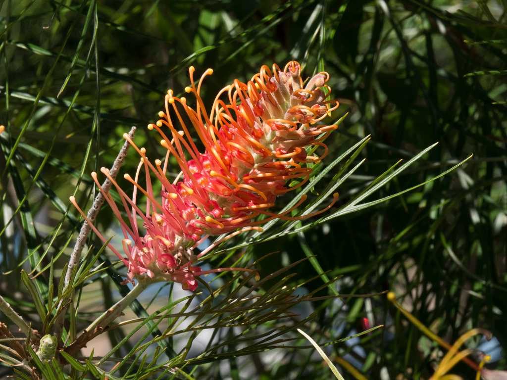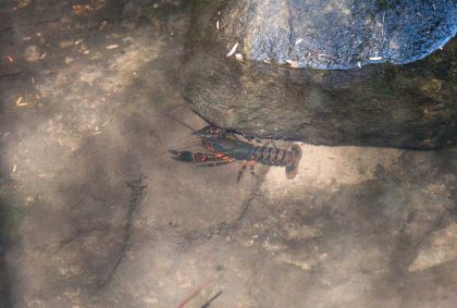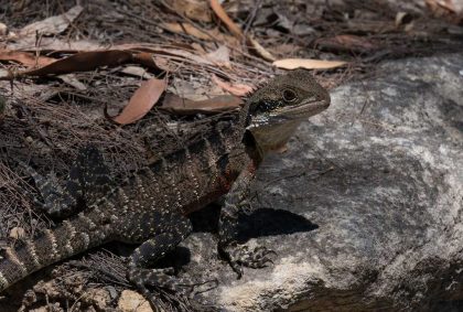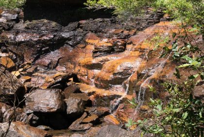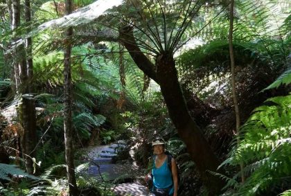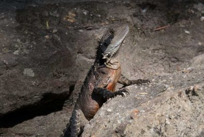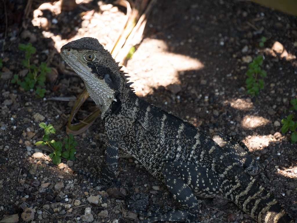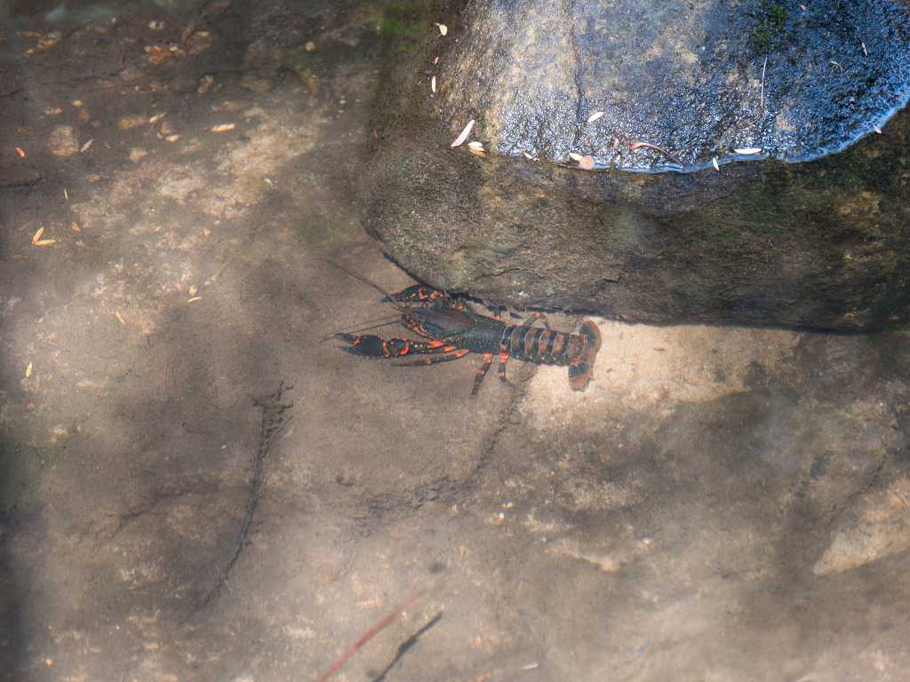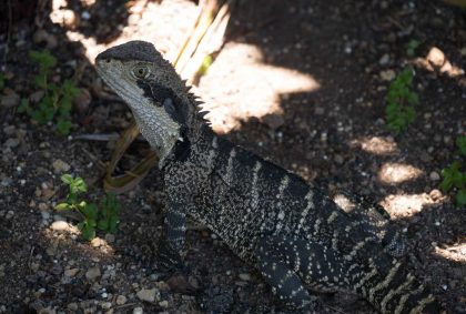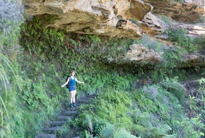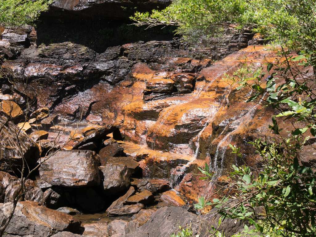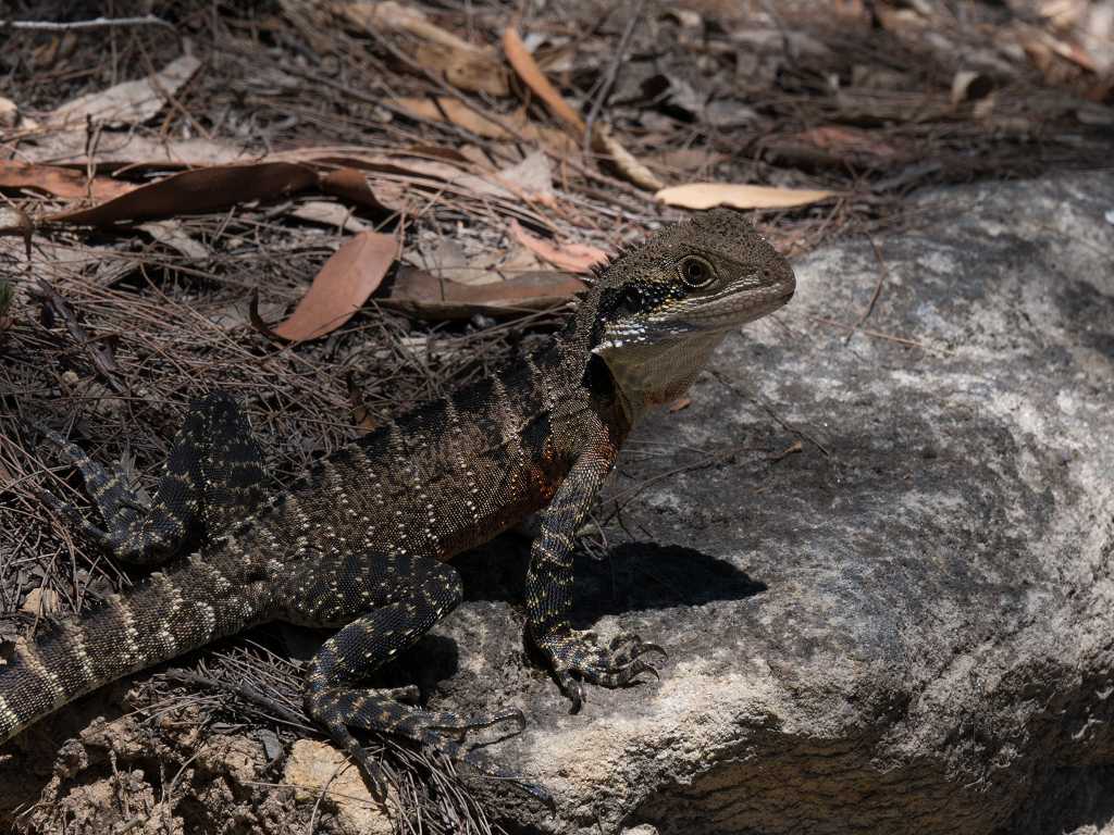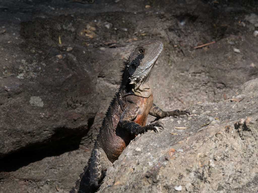 Ein kurzer Loop führt uns über Stufen und Stege in eine enge feuchte Schlucht hinein. Hier wechselt auch die Vegetation. Im Schatten eines Felsvorsprungs legen wir Picknick ein und locken mit unseren Brotkrümeln einen frechen, furchtlosen Skink an, der sogar über meinen Rucksack klettert.