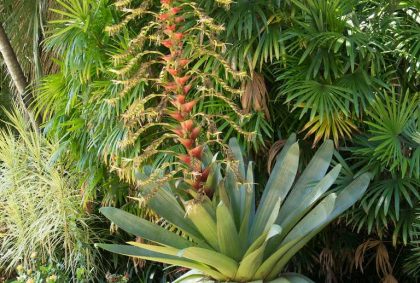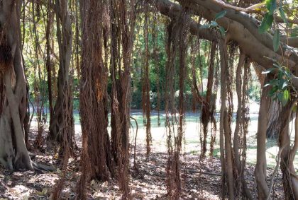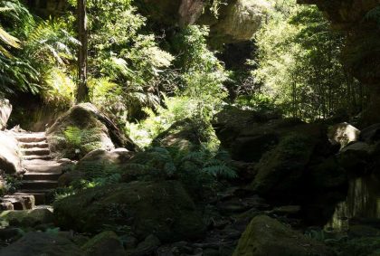 Zuerst steigen wir über Stufen aus natürlichem Gestein hinab in eine feuchte Klamm. Hier dominieren Farne, Moose und Bäume aus Feuchtgebieten die Vegetation. Wasser tropft von Bäumen und Felsen, es ist angenehm kühl.