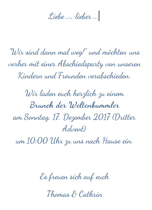 Wir wollten uns nicht einfach so davonschleichen, also luden wir am 17.12.17 zu einem Auszeitbrunch ein. Einheimische und regionale Spezialitäten aus den Ländern, die wir bereisen werden , standen auf dem Buffet zum Verzehr bereit. Es war lustig und unterhaltsam. Hungrig oder durstig hat uns sicher keiner verlassen.