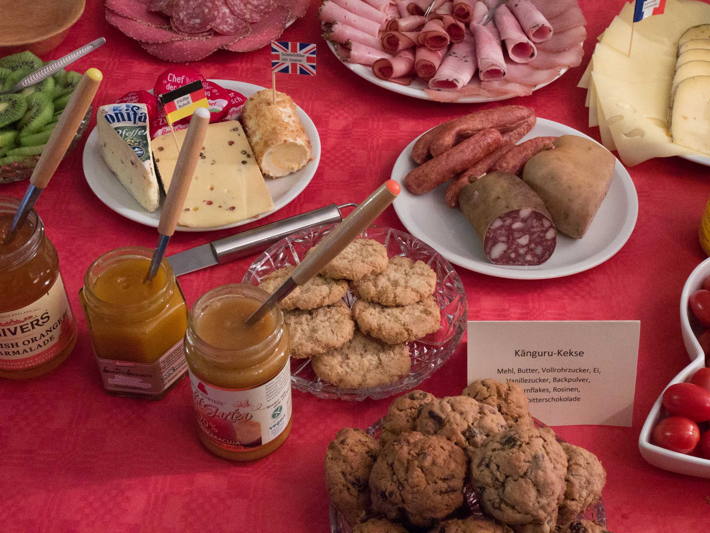 Die Zeit verging wie im Fluge und das Mittagsbuffet wurde aufgetragen, „Neuseeländische Kürbis-Süßkartoffel-Suppe“ hatte unsere Tochter Anna gekocht, „Rotes Thai-Curry“ sowie ein „Thailändisches Gemüse mit Tofu“ wurden geliefert, den „Australischen Hirschgulasch“ bereitete Ruth vor und dann gab es noch „Fisch Balinesisch“ . Alles interessante Geschmackskompositionen, es war wohl für jeden etwas dabei. Auch Annas Kiwitorte war super lecker.