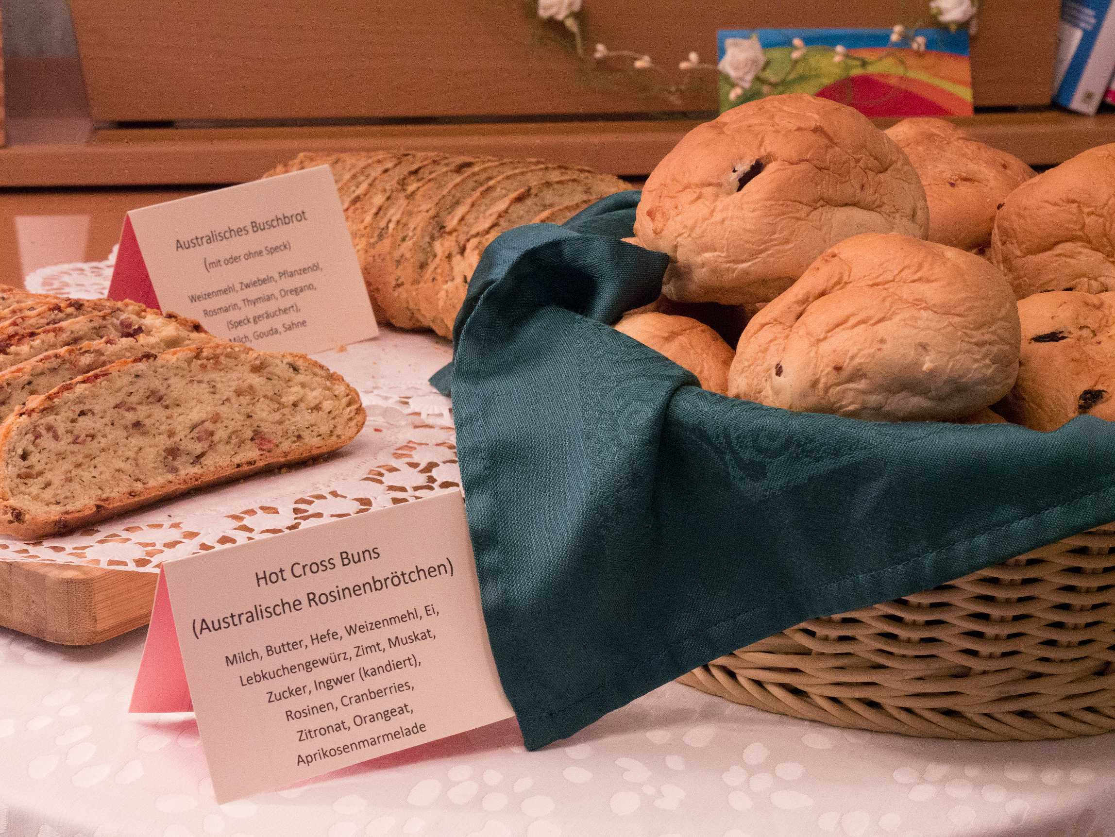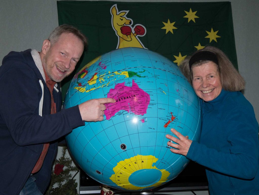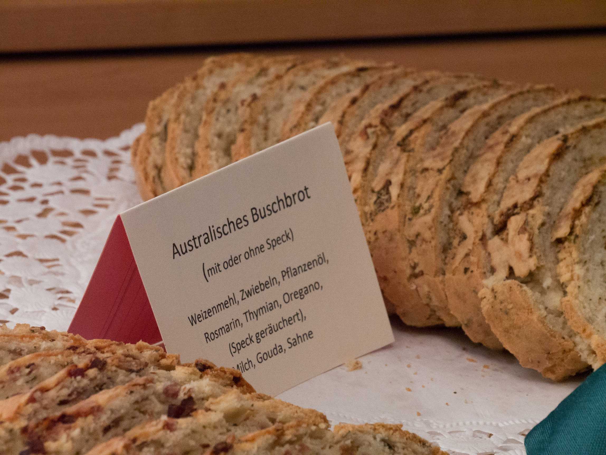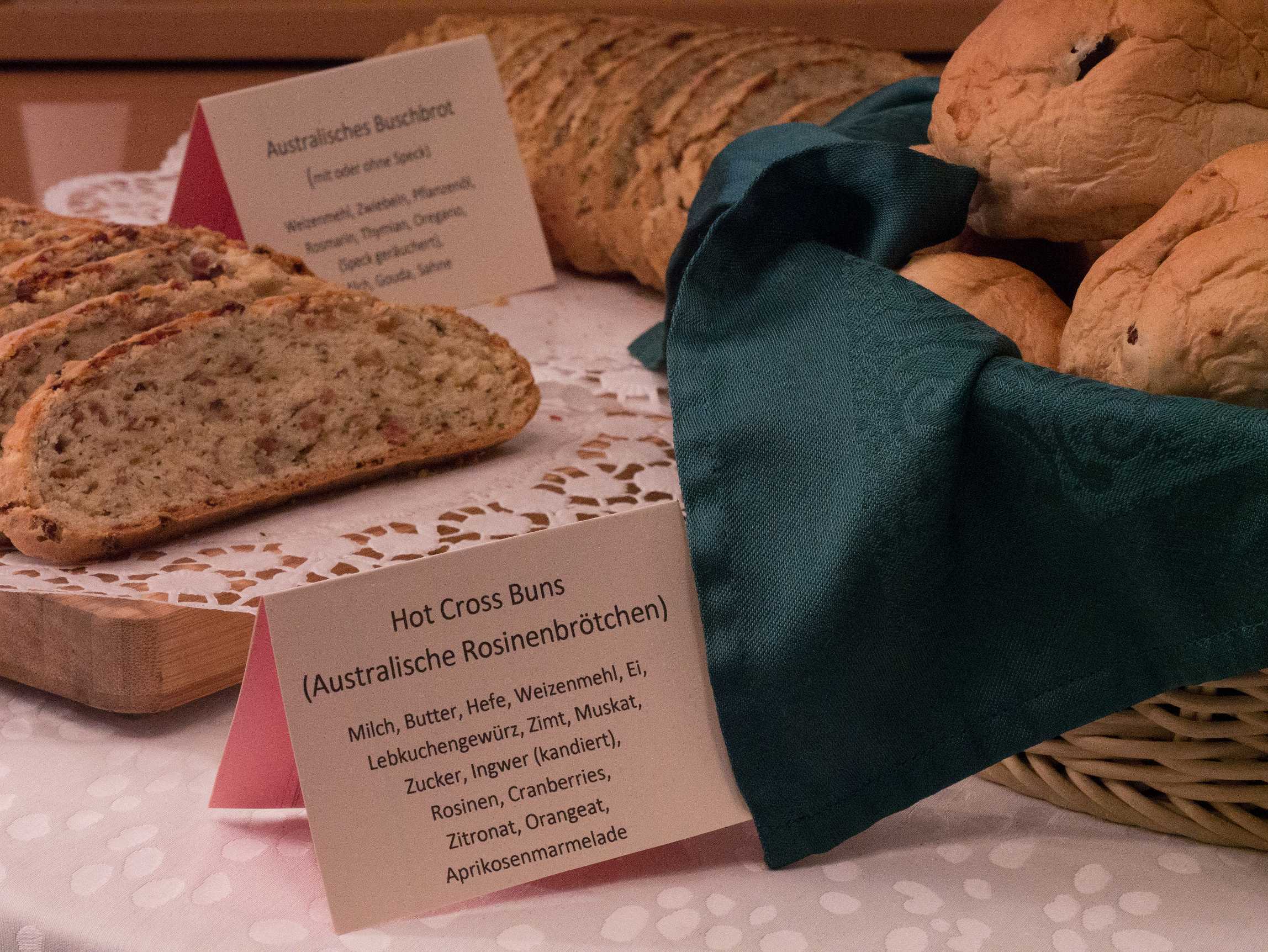 Bereits die Begrüßung, die uns Ruth & Martin mit einer riesengroßen Weltkugel bereiteten, war eine gelungene Überraschung! Nach dem Sektempfang war das Frühstücksbuffet eröffnet und alle konnten sich erst einmal stärken. Besonders schmackhaft war das „Australische Buschbrot“ mit und ohne Speck, welches uns ein lokaler Bäcker nach unserem Rezept am Morgen frisch gebacken hatte.