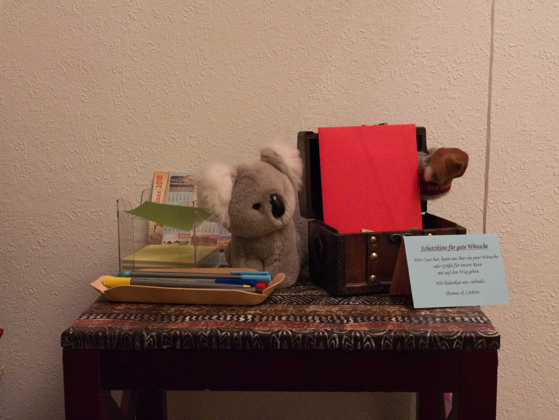 Beim Programmpunkt Scherzfragen erfuhren unsere Gäste unter anderem, was man bekommt, wenn man einen Elefanten mit einem Känguru kreuzt, nämlich „tiefe Löcher in ganz Australien“ . Alle nutzten auch reichlich unsere „Schatzkiste“, indem sie uns viele gute Wünsche und so manche nützlichen Dinge mit auf den Weg gaben!